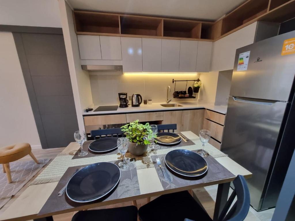 Zona de cocina, Nevera, Microondas, Cocina, Horno, Productos de limpieza, Mesa de comedor, Copas de vino