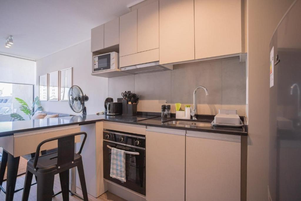 Disfruta de un Moderno Depto con Piscina y gym dispone de estacionamiento para sus huéspedes.