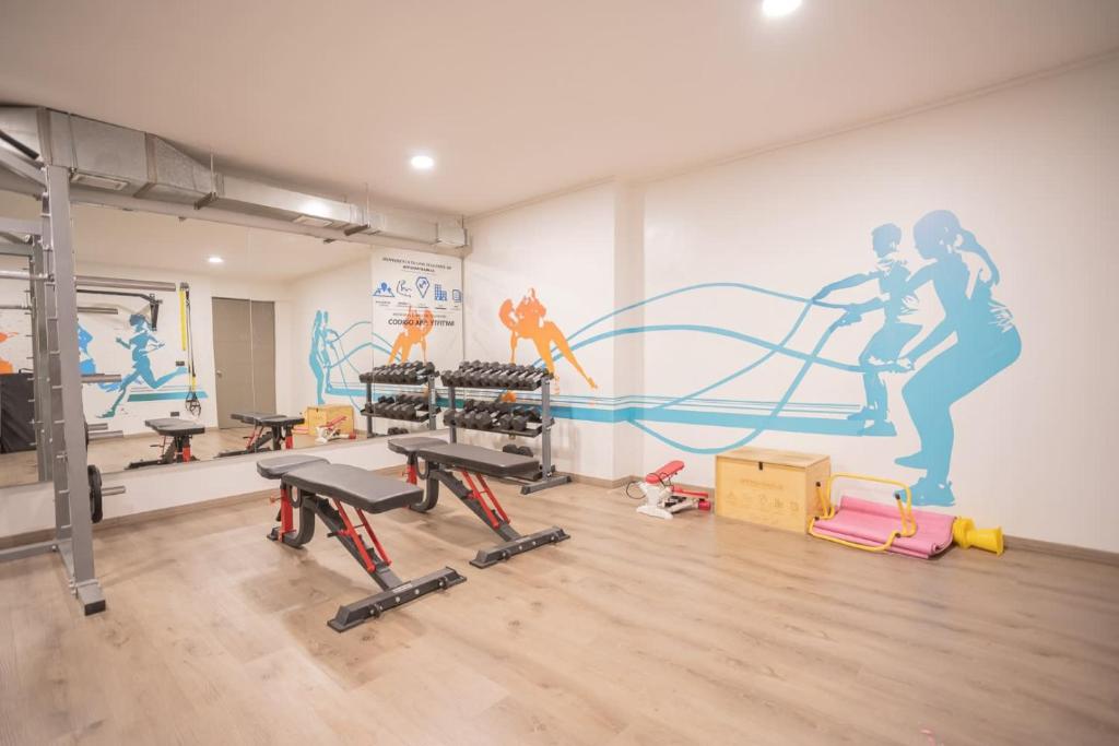 Gimnasio equipado para su rutina diaria.