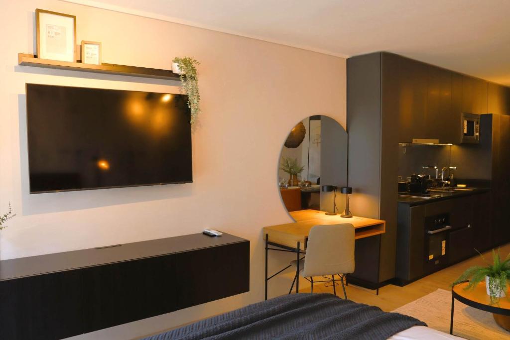 In the well-equipped kitchen, guests will find a stovetop, a refrigerator, kitchenware and a microwave. The air-conditioned studio features a TV, a private entrance, a tea and coffee maker, a wardrobe as well as city views.